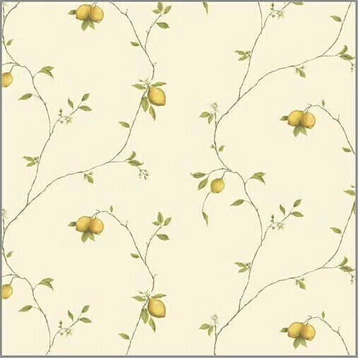 Tags: papel de parede limão siciliano, fundo bege claro, ramos finos com folhas e limões amarelos, padrão orgânico e espaçado, estilo mediterrâneo, papel de parede copa ou área externa